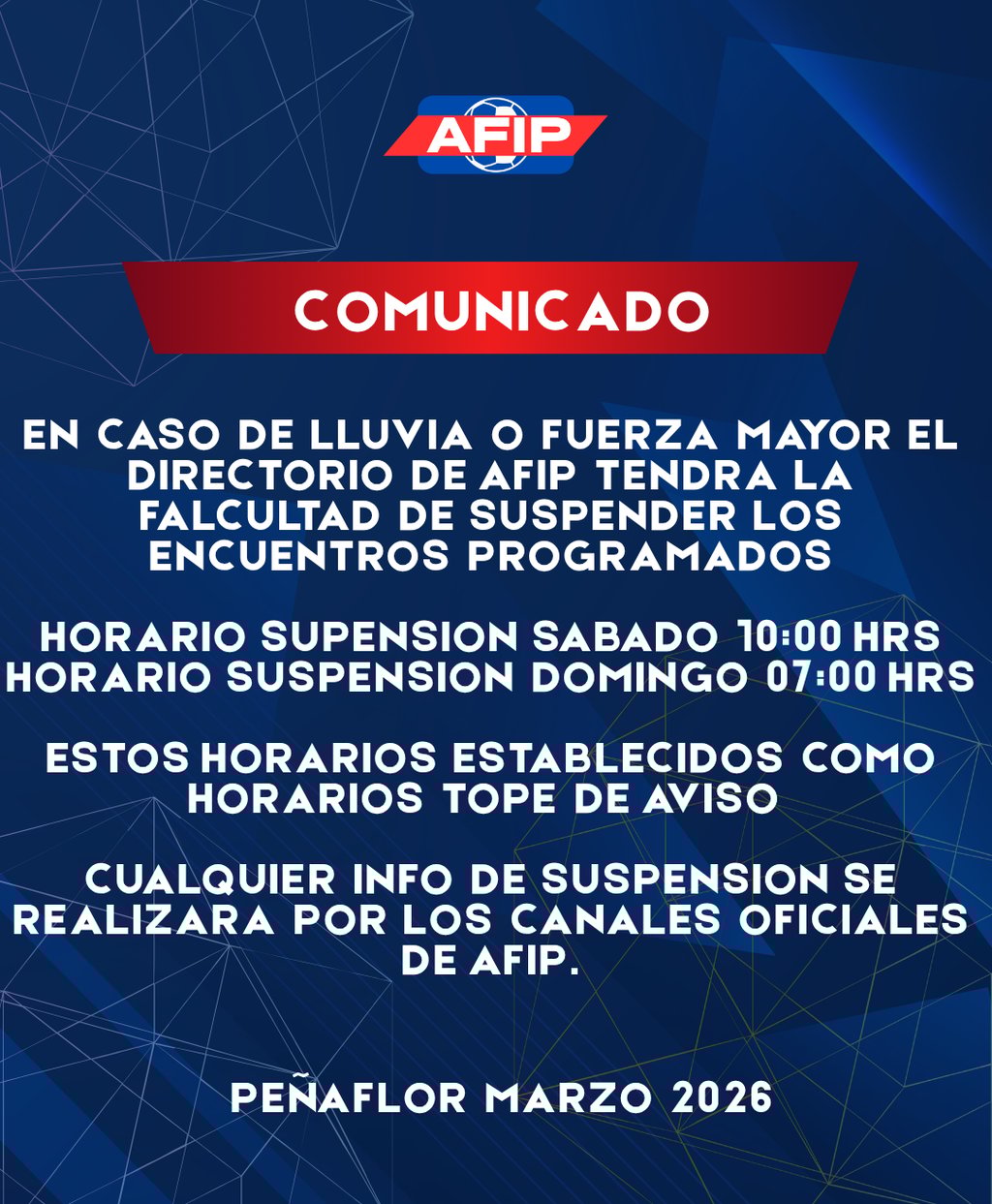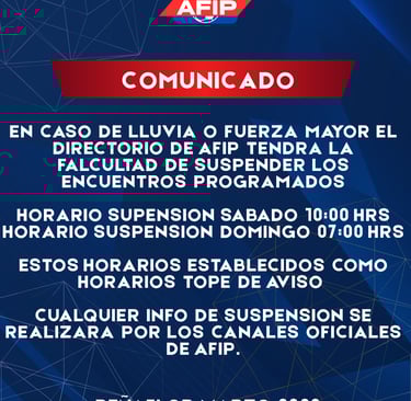 en caso de lluvia o fuerza mayor el directorio de AFIP tendra la falcultad de suspender los encuentros programados horario supension sabado 10:00 Hrs horario suspension domingo 07:00 Hrs estos horarios establecidos como horarios tope de aviso cualquier info de suspensión se realizara por los canales oficiales de afip.